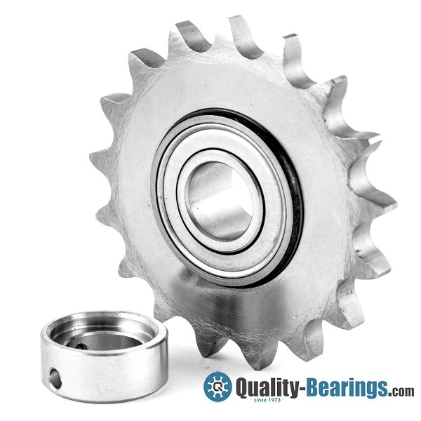Chain tensioning wheels are chain guide and deflection units for bush and roller chains. They compensate for operational chain elongations and improve the smooth running of the system under high loads and speeds. The ready-to-assemble units consist of sprocket discs and deep groove ball bearings or radial insert bearings. The sprocket discs are made of high-strength steel, sintered iron or plastic (polyamide). Sprocket discs made of plastic run particularly smoothly and quietly. Since the inner ring of the deep groove ball bearing is extended on both sides, no additional spacer rings are required. In the KSR..-B0 series, the inner ring is fastened to the shaft with a clamping ring. Our range includes sprockets from the premium manufacturer INA. The bearing bore of this series has a plus tolerance. This means that unmachined shafts up to ISO tolerance h9 can be used for medium loads and speeds. The ready-to-assemble units consist of deep-drawn, profiled and riveted sheet steel discs and grooved ball bearings. Larger disc diameters are additionally welded. A running-in phase on the pulley profile avoids damage to the belt. Due to the sheet metal design, the additional rotating masses and resulting imbalances are only small. Chain tensioning wheels are greased with a lithium soap grease according to GA13 and are maintenance-free. The grooved ball bearings of the chain tensioning wheel are sealed on both sides.